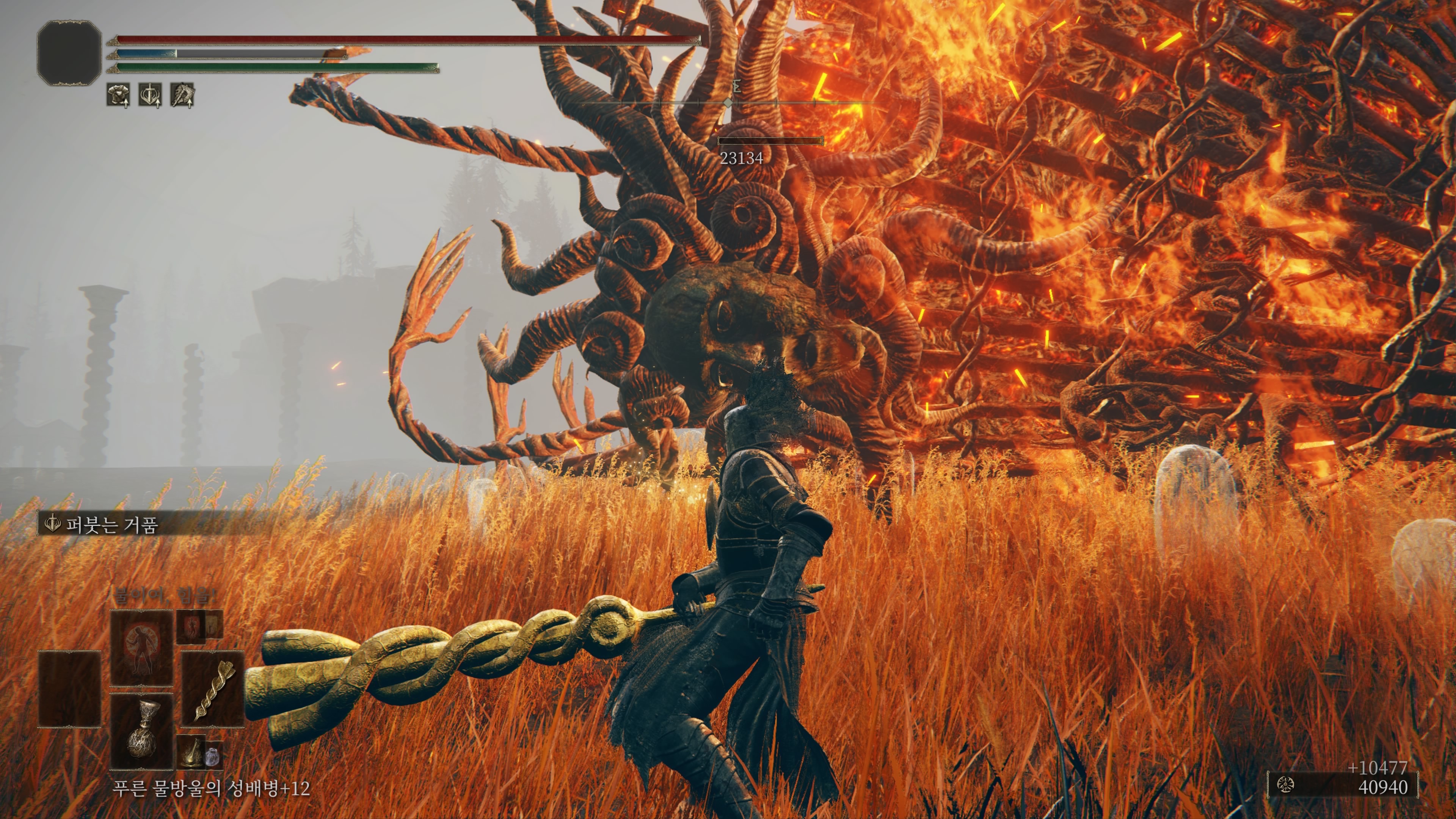 얼굴이 왼쪽으로 향하게 넘어지니, 그리로 가서 앞잡하자. 한번에 대략 56,000딜? 드간다.